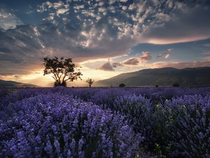 Path, trees, heath, viewes, Fog, heathers, car in the meadow, morning