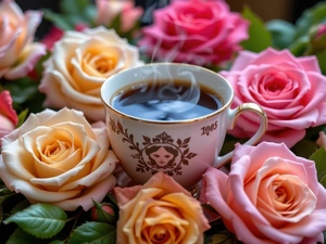 cappuccino, plate, Ai, Flowers, roses, coffee, cup, color