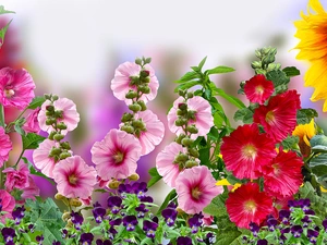 Hollyhocks, Lamp, napkin, jug, glasses, Bouquet of Flowers, composition, Books