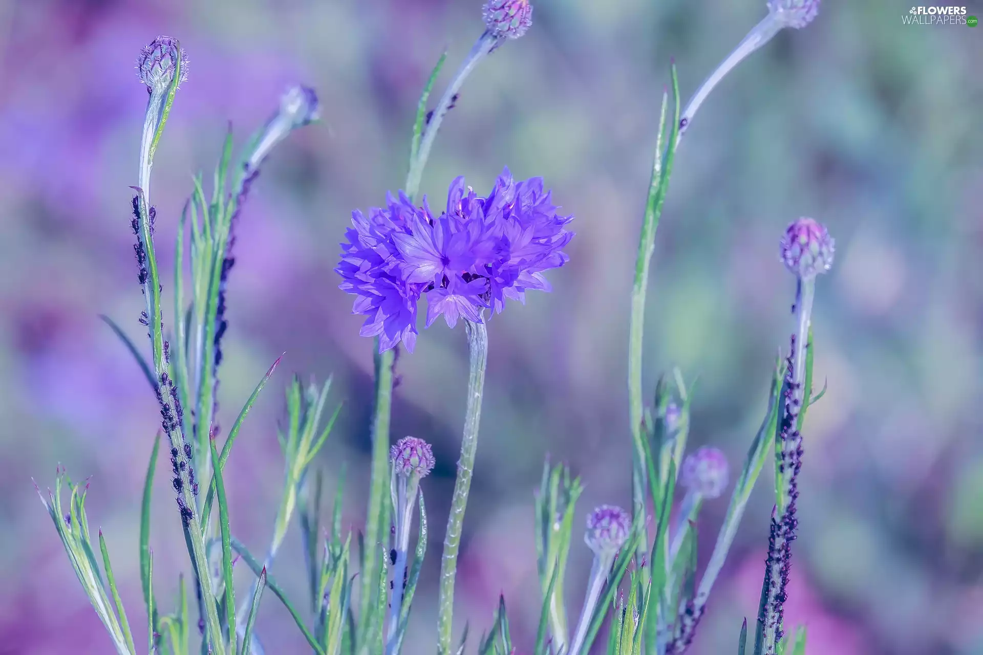 blurry background, cornflowers, insects