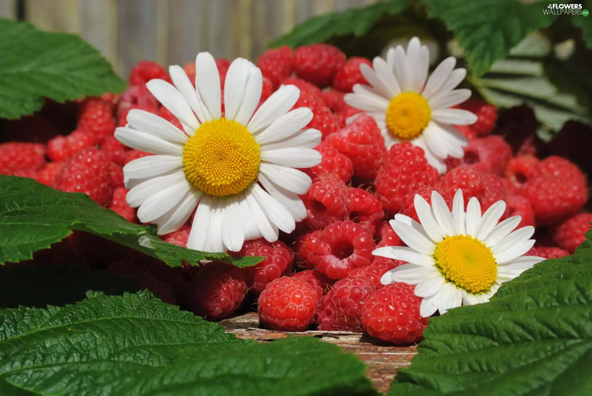 Leaf, raspberries, daisies