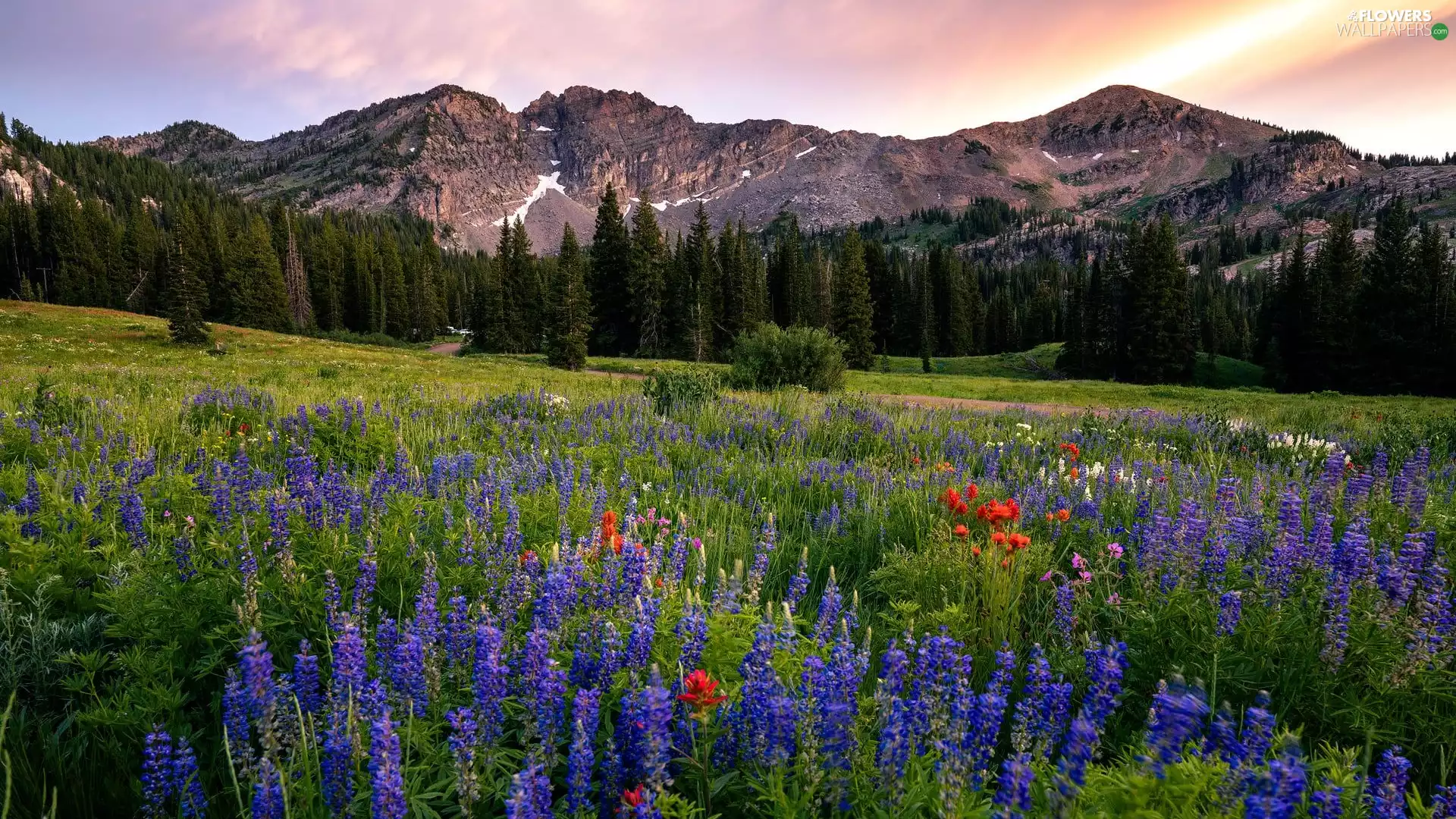 viewes, Mountains, Flowers, lupine, Meadow, trees