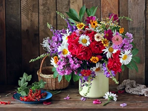 pitcher, Flowers, cloth, picture, navy blue, Chrysanthemums